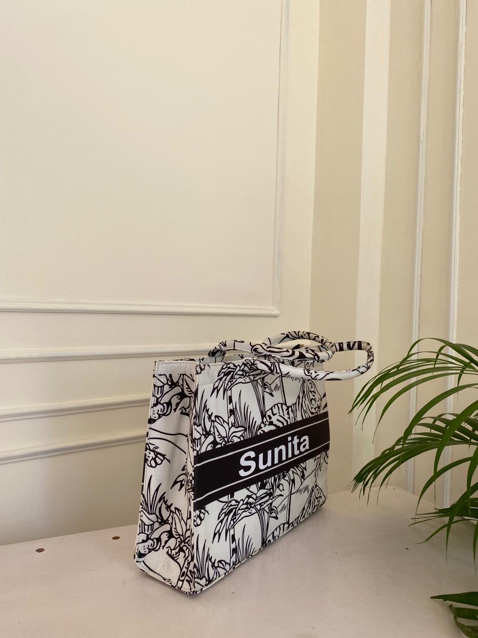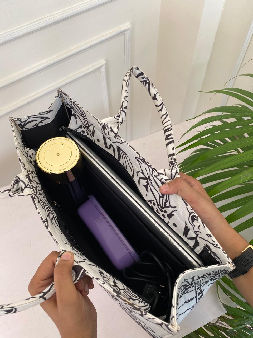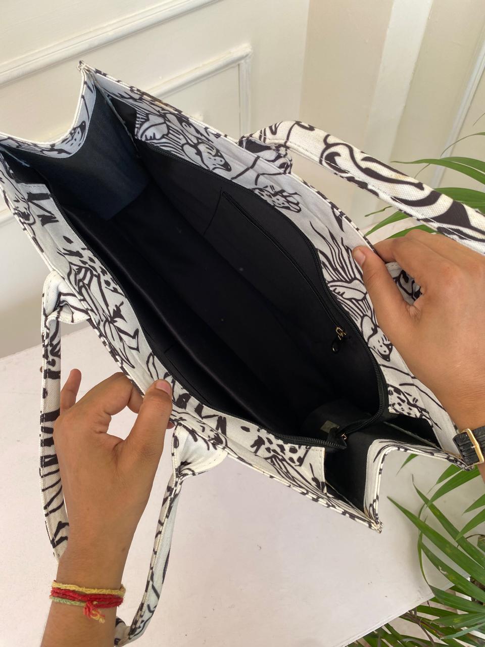 Customisable canvas tote with laptop compartment and bold white tiger print, perfect for everyday office use.